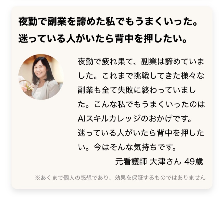 これまで色々なAIセミナーやAI活用の講義を受けましたがどれも実践的ではなく挫折してしまいました。 これで最後の挑戦にしようと迷いながら選んだのがこのAIスキルカレッジです。人を気持ちを動かす手法と具体的なAI動画の作り方を徹底的に教えていただいたので挫折することなくここまで来れました。